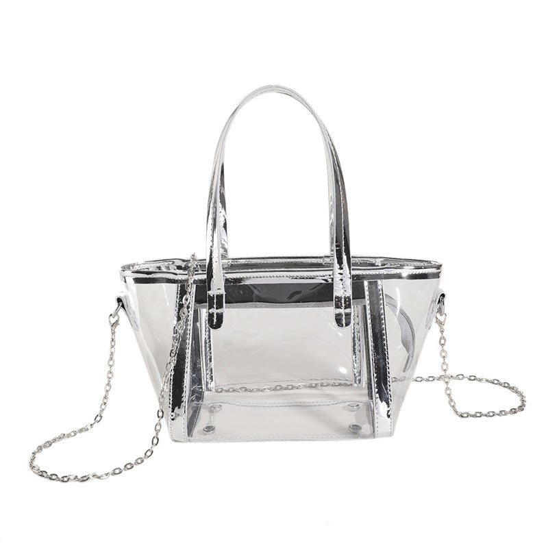 Introducing the Aya Clear Handbag, a bold blend of modernity and elegance. This handbag shines in a vibrant pink and is made with high-quality clear PVC that promises durability without sacrificing style. The bag features a spacious interior to carry your essentials with ease. Complementing the striking color is a chic metallic chain for crossbody wear, providing a hands-free experience without compromising on sophistication. This handbag is perfect for those who dare to stand out from the crowd. Whether you're at a brunch or an evening event, the Aya Clear Handbag is your statement piece for any occasion.