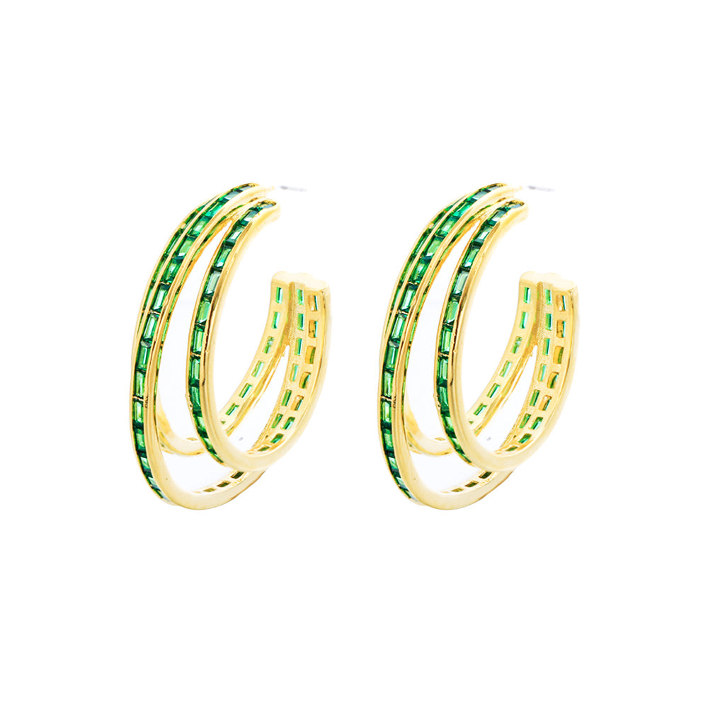 Discover the epitome of luxury with our New Beryl Designer Hoop Earrings. These elegant hoops are a masterpiece of design, featuring a double layer of polished gold-tone metal that glimmers with every turn. Encrusted along the outer curve are rows of exquisite beryl-green crystals, offering a rich contrast and a touch of opulence. The inner gold layer boasts a hollowed-out pattern that lends a sophisticated airiness to the design. Perfect for those who covet jewelry that balances boldness with classic style, these earrings are a testament to impeccable craftsmanship. Add a dash of color and a sparkle of sophistication to your wardrobe with these breathtaking beryl hoop earrings.