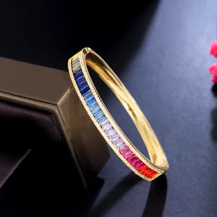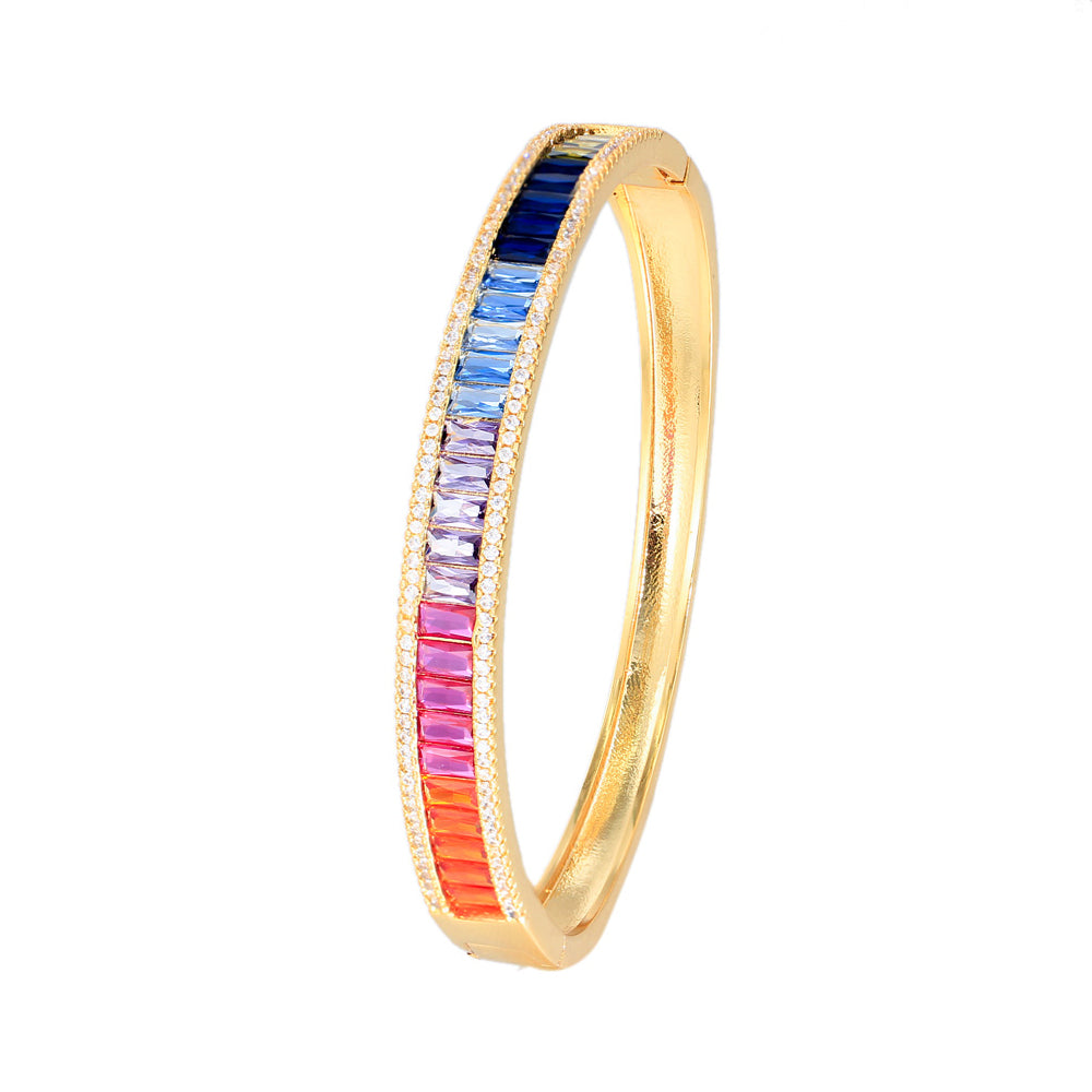 The Blaise Designer Bracelet is a symphony of color encased in gold, a stunning accessory that captures the essence of modern luxury. This slim bangle-style bracelet is crafted from high-quality gold-tone metal, providing a warm, lustrous backdrop to the series of baguette-cut crystals that parade across its surface. Each crystal is carefully set to showcase a gradient of hues, ranging from deep blues to vibrant pinks and fiery oranges, resembling a sunset captured in gem form. With its sleek profile and rainbow of colors, the Blaise Designer Bracelet is perfect for those who love to make a subtle yet impactful style statement. It's an exquisite piece that celebrates the joy of color and the finesse of fine jewelry design.