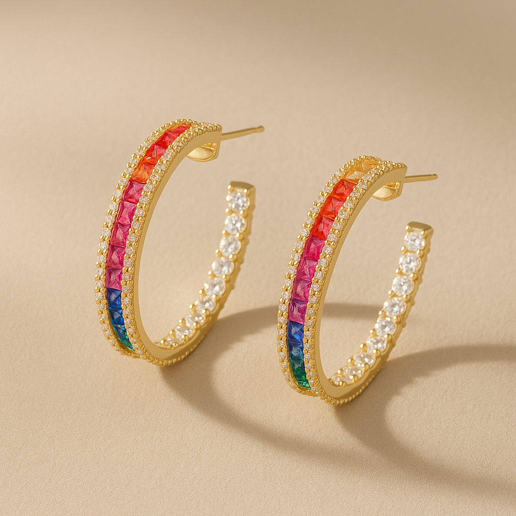 Light up the room with the Blaise Earrings – bold gold-tone hoops adorned with vibrant rainbow stones and framed in shimmering crystals. The perfect statement piece for color lovers and trendsetters.
