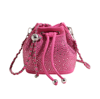 Featuring a soft dark pink velvet base, sparkling rhinestones, and a silver-tone drawstring closure, BRENNA delivers instant elegance. A chain-link strap with faux leather detailing adds comfort and luxury—perfect for evening events or any moment that calls for standout style.