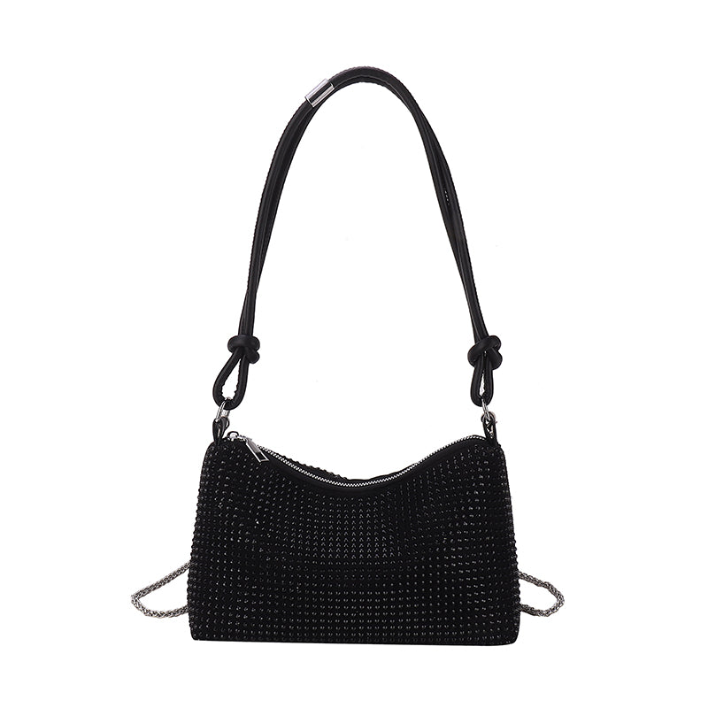 The Charlotte Handbag is a sleek and sophisticated accessory, designed for those with an eye for style and a love for luxury. It features a streamlined silhouette covered in an array of gleaming studs that provide an opulent sparkle. The slender strap knots elegantly on either side, offering a comfortable shoulder carry. A zipper closure runs smoothly across the top, securing your essentials within. This handbag is a versatile piece that seamlessly transitions from a day in the office to an evening affair, making it an essential addition to any wardrobe.