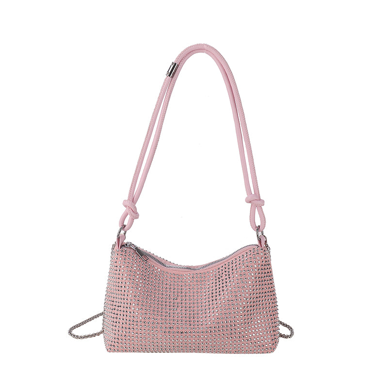 The Charlotte Handbag is a sleek and sophisticated accessory, designed for those with an eye for style and a love for luxury. It features a streamlined silhouette covered in an array of gleaming studs that provide an opulent sparkle. The slender strap knots elegantly on either side, offering a comfortable shoulder carry. A zipper closure runs smoothly across the top, securing your essentials within. This handbag is a versatile piece that seamlessly transitions from a day in the office to an evening affair, making it an essential addition to any wardrobe.