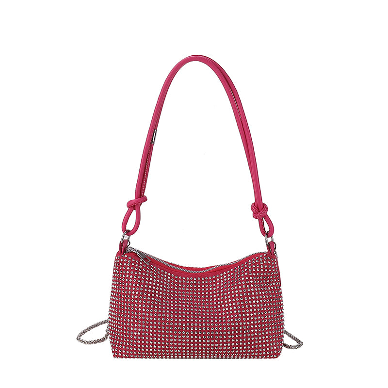 The Charlotte Handbag is a sleek and sophisticated accessory, designed for those with an eye for style and a love for luxury. It features a streamlined silhouette covered in an array of gleaming studs that provide an opulent sparkle. The slender strap knots elegantly on either side, offering a comfortable shoulder carry. A zipper closure runs smoothly across the top, securing your essentials within. This handbag is a versatile piece that seamlessly transitions from a day in the office to an evening affair, making it an essential addition to any wardrobe.