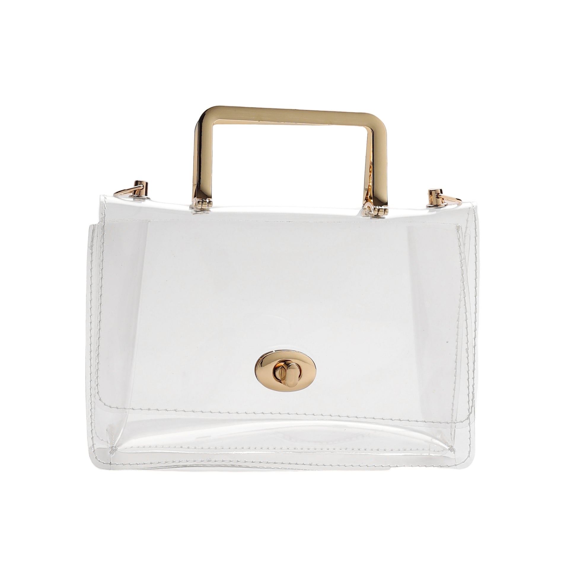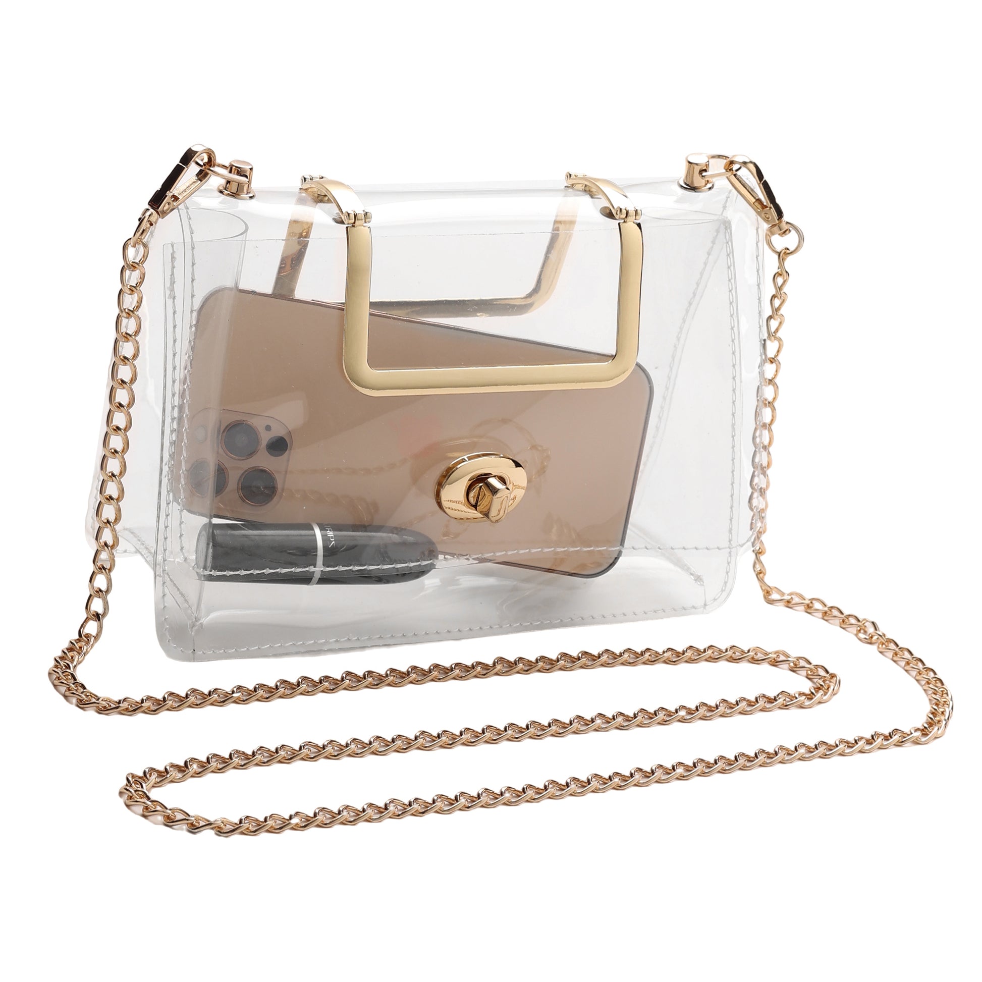 Made with durable crystal-clear PVC, Courtney includes an adjustable gold chain-link strap as well as designer gold handles to meet your style needs. It's the perfect concert companion and guaranteed to make you stand out!