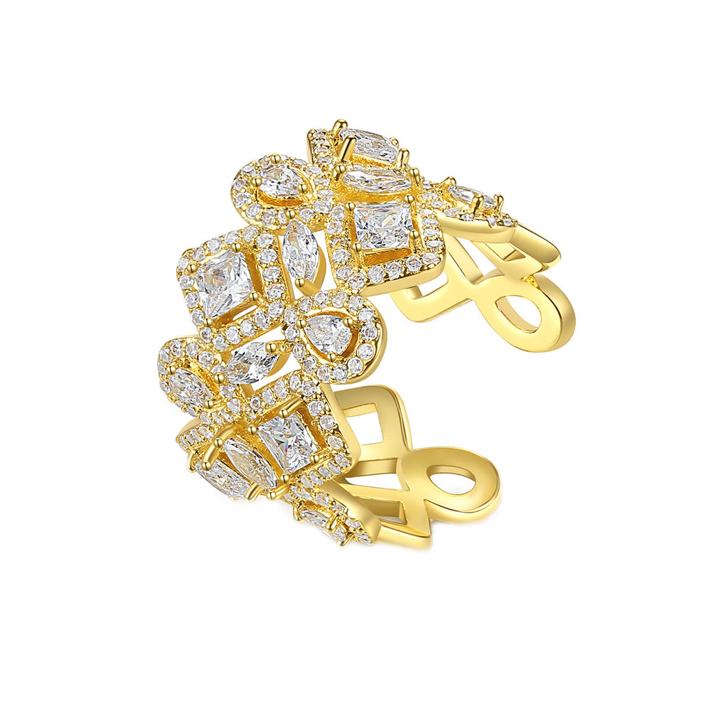 The Elie Adjustable Ring is a dazzling statement piece crafted with precision and elegance. Featuring a stunning array of radiant cubic zirconia stones set in an intricate design, this adjustable ring ensures a perfect fit for any occasion. Add timeless glamour to your collection with this show-stopping accessory!