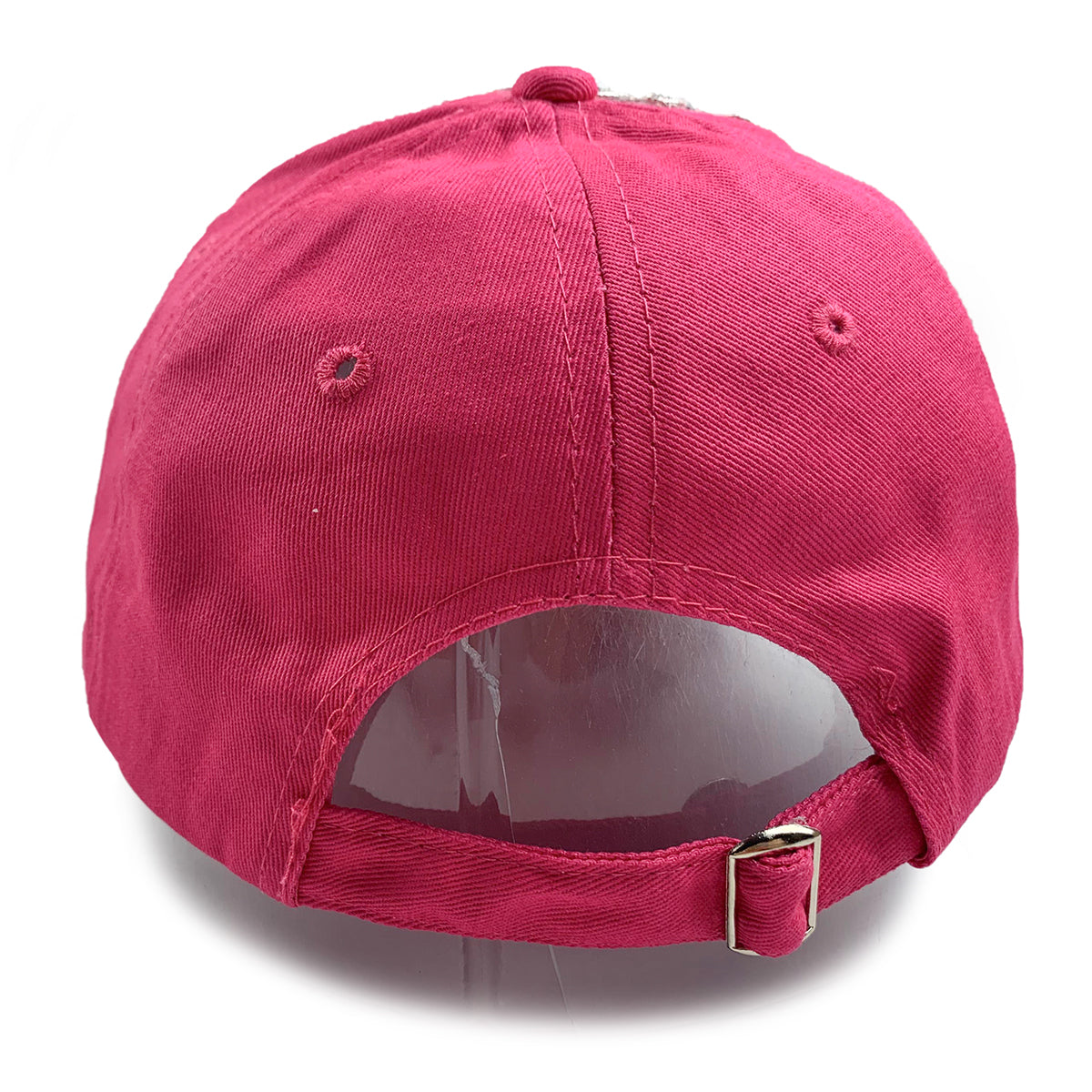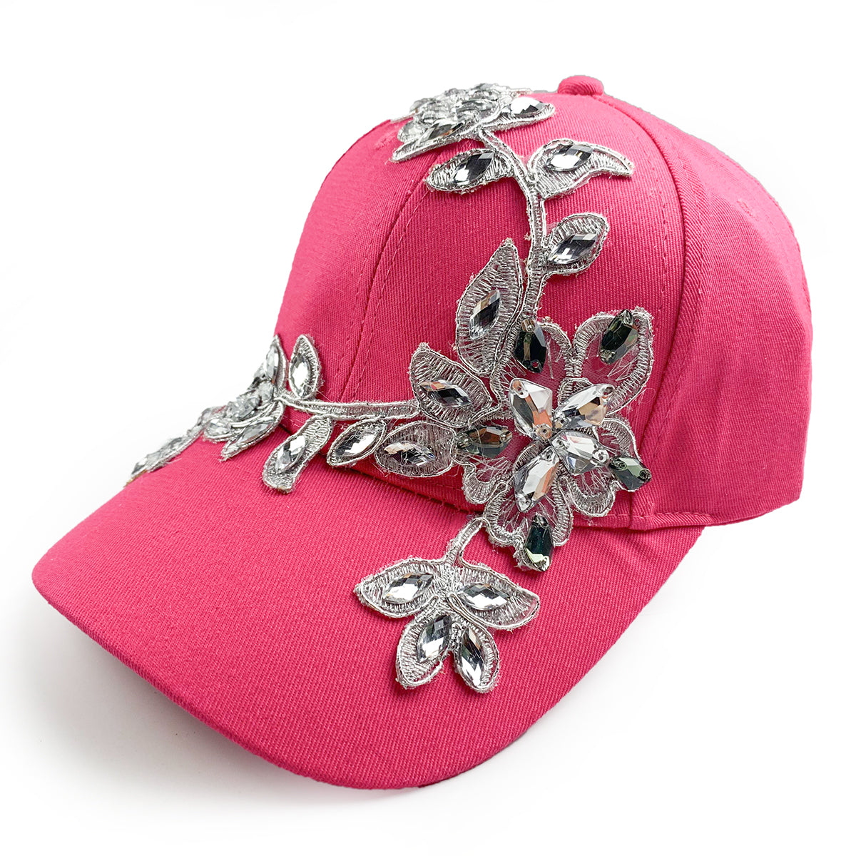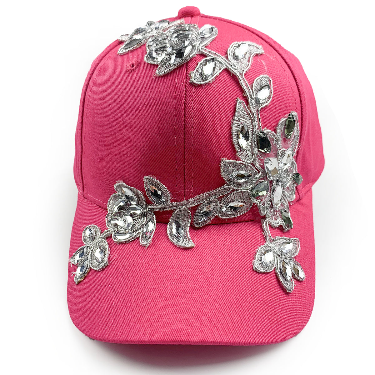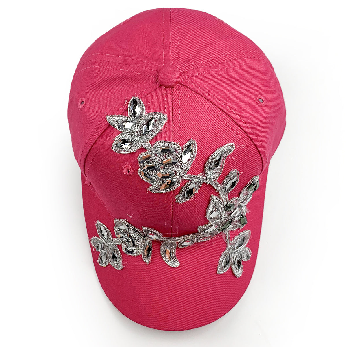 Flora Baseball Hat in dark pink is made with cotton and ordained with a gorgeous floral crystal pattern!
