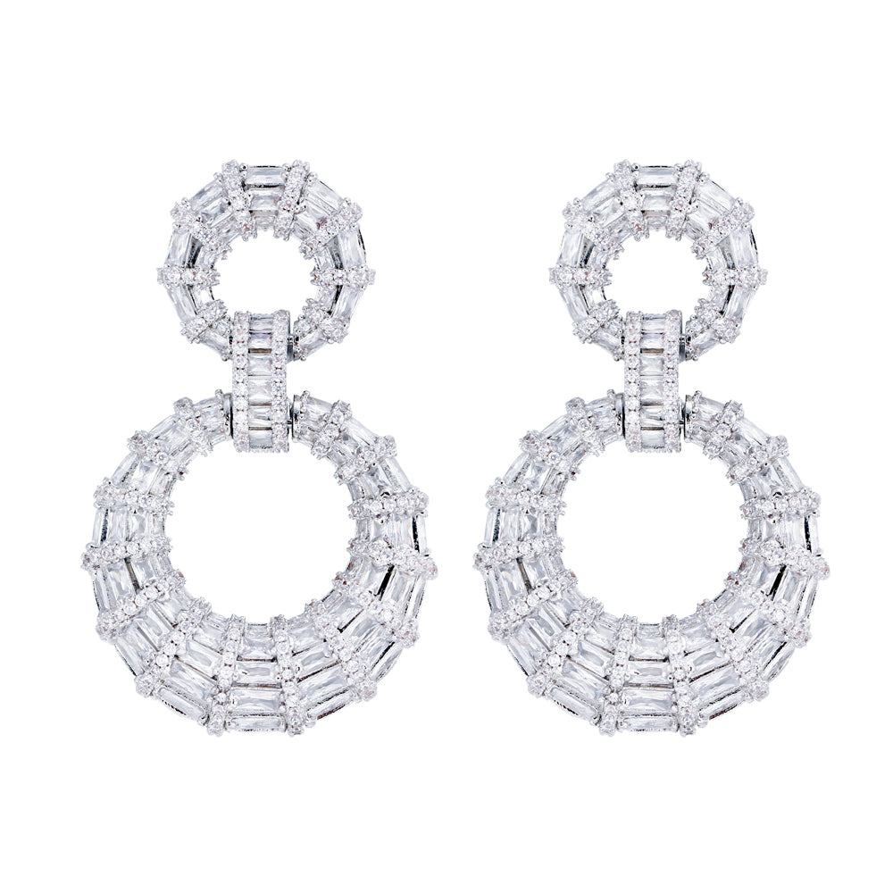 The Gretel Designer Earrings are a stunning homage to geometric elegance and sparkling sophistication. These eye-catching earrings feature a double-tiered design with concentric circles made of baguette-cut crystals meticulously set to create a dazzling, structured form. The silver-tone finish enhances the clarity and shine of the crystals, allowing these earrings to reflect light beautifully. The interplay of linear crystal placement with the round shape adds a contemporary twist to a classic aesthetic. With a comfortable post back, the Gretel Designer Earrings are designed to make a bold statement, perfect for adding a touch of architectural glamour to any refined ensemble.