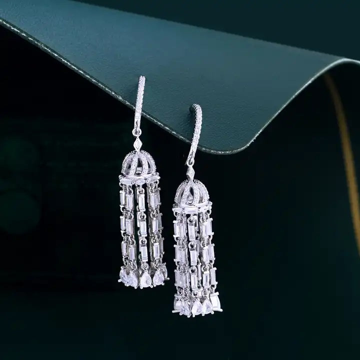 The India Designer Earrings are a majestic and intricate addition to a sophisticated wardrobe. These long drop earrings feature a stunning pavé-encrusted hook that extends into an elaborate structure, reminiscent of grand architectural designs. The body of the earring is composed of vertically set baguette-cut crystals, creating a cascading effect that is both elegant and opulent. The earring concludes with a fringe of round-cut crystals, adding movement and an extra layer of shimmer. Executed in a silver-tone finish, these earrings reflect the light with every turn, providing an impressive display of brilliance. Ideal for those who seek to make a statement, the India Designer Earrings are a luxurious choice for evening events and celebrations.
