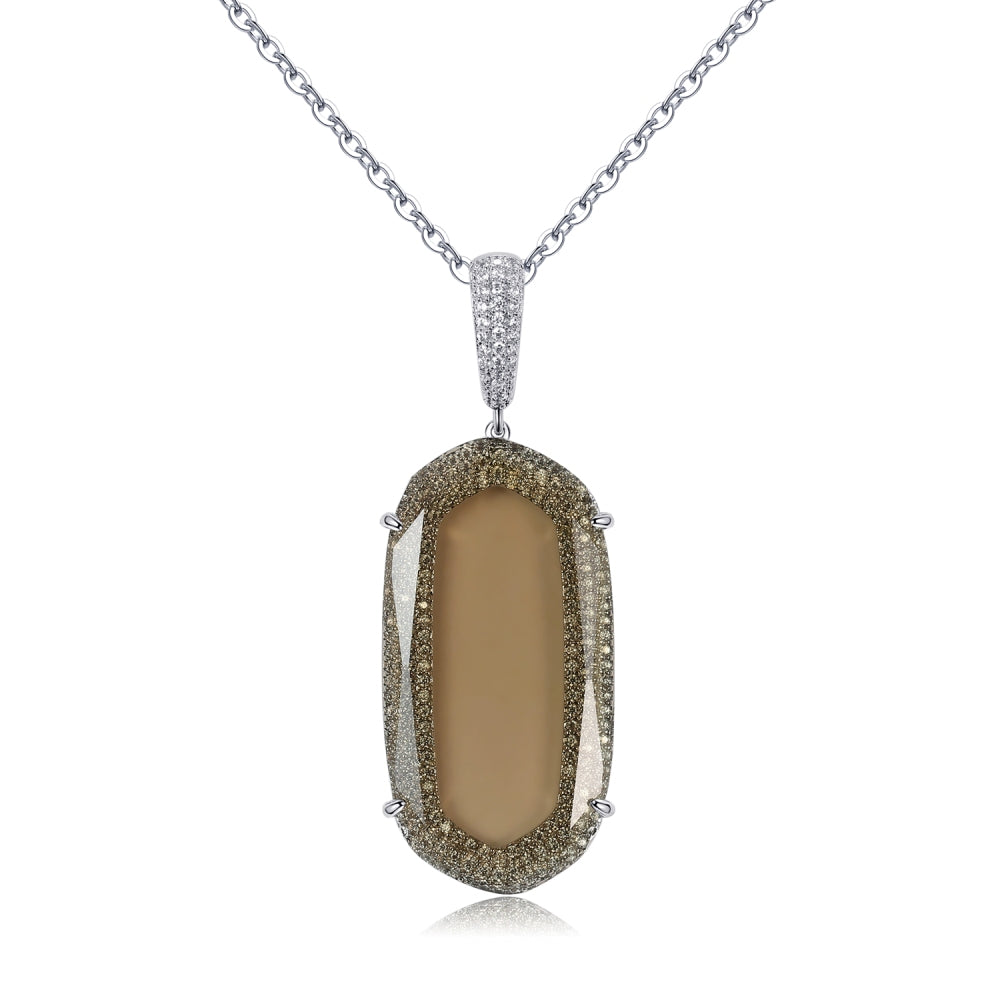 Our Jamila necklace accents eye-catching sparkle & the perfect accessory to dress up or down! This gorgeous necklace is paired with the Translucent Icon Collection, detailed with outer layer rows of clear cubic zirconia backing then meticulously set with a unique cut bronze synthetic gemstone on top. The design exudes a hypnotic elegance and a Must Have in the Natalie Mills collection! The Translucent Icon Collection is inspired with a message that true beauty shines from within.