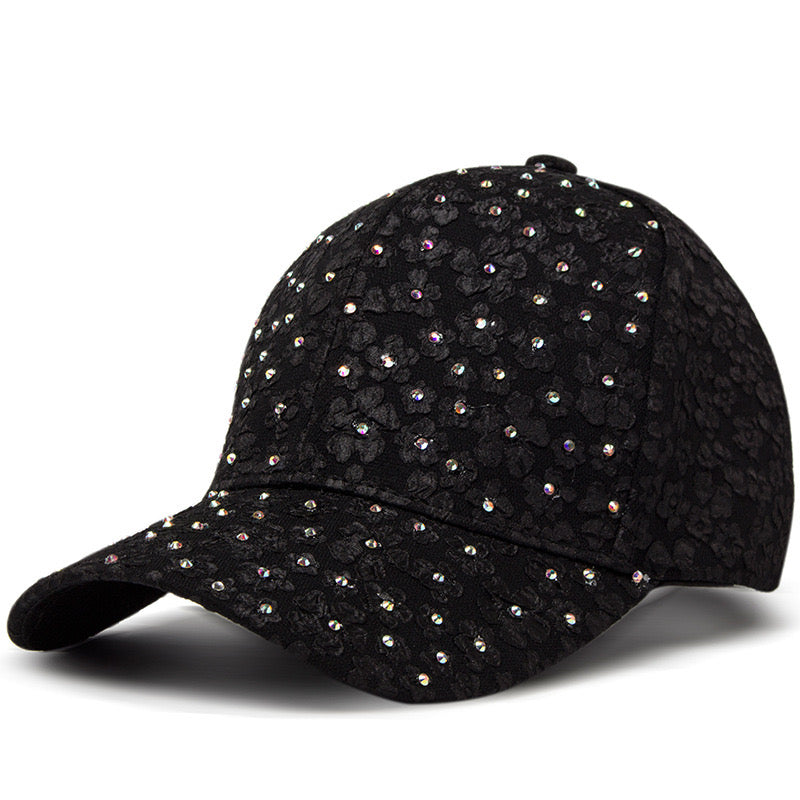 Embrace the charm of spring with the New Kamila Crystal Hat, where elegance meets whimsy. This black baseball cap is beautifully embellished with a floral lace overlay, each delicate flower centered with a radiant crystal to catch the light with every move. The soft pastel color and the gentle shimmer of the crystals make it a perfect accessory for a sunny day out or a casual brunch with friends. Made with a comfortable fabric blend and equipped with an adjustable strap, the Kamila Crystal Hat combines comfort with the luxury of detailed craftsmanship.