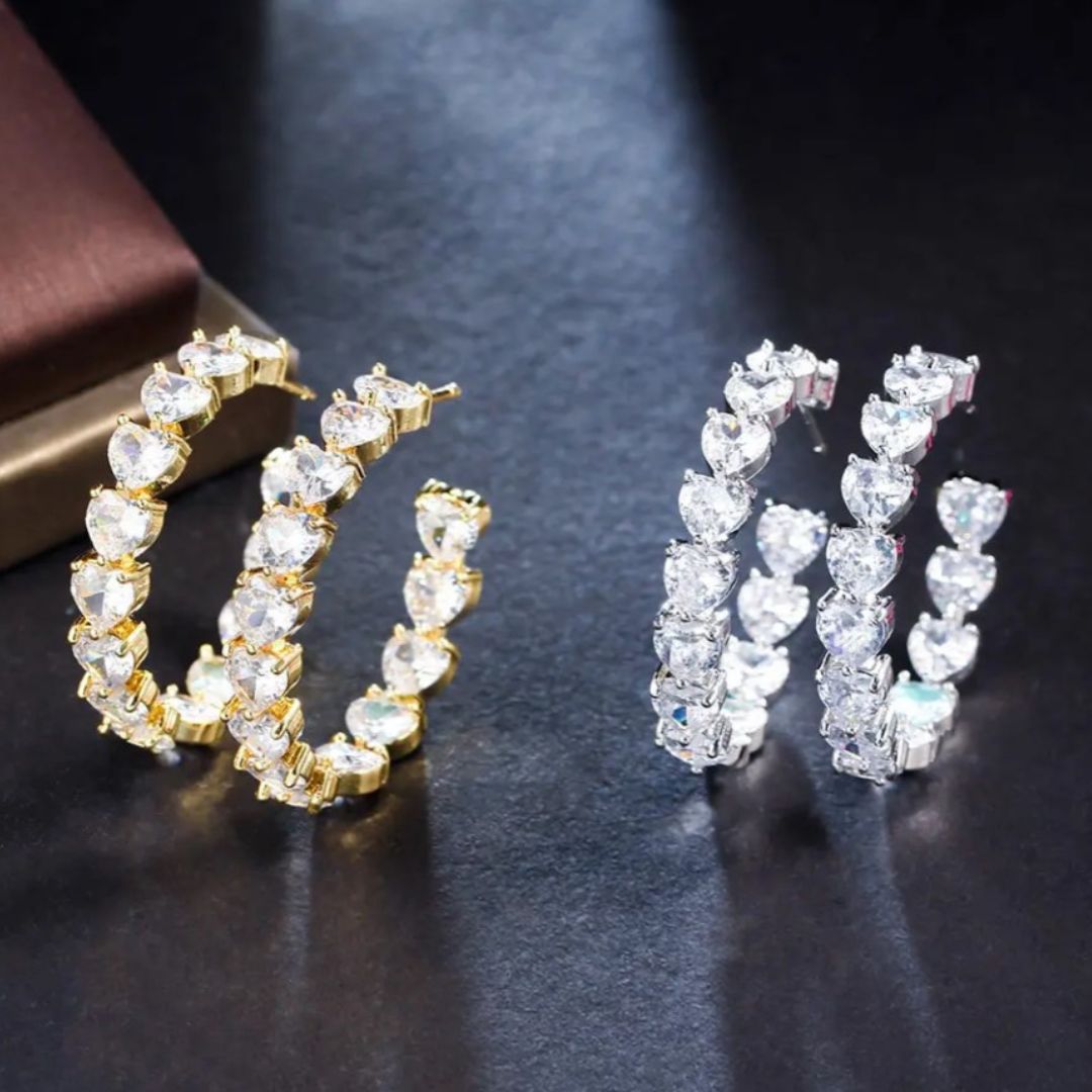 The Kordelia Heart Earrings are a dazzling expression of craftsmanship and style. These striking earrings feature a cascade of heart-shaped crystals, each cradled in a silver prong setting that enhances their brilliance. The stones are arranged in a unique interlocking pattern, offering a dynamic play of light with every movement. The earrings are secured with a classic post back, ensuring they sit comfortably while making an opulent statement. Ideal for evening events or as a standout accessory for daytime elegance, the Kordelia Heart Earrings are sure to captivate and charm.