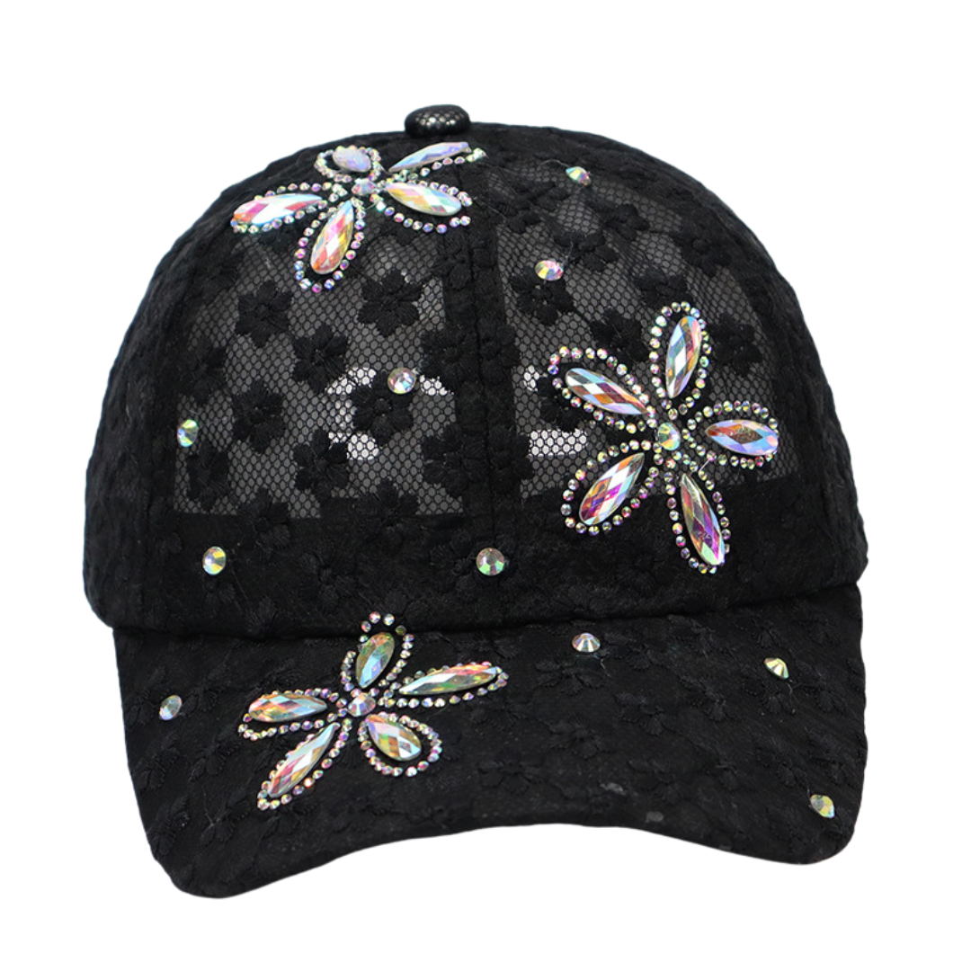 The Liela Floral Crystal Hats bring bold glamour with oversized flower-shaped crystals on textured floral lace. Light-catching and full of personality, these hats are a statement in every shade—white, black, or light pink.