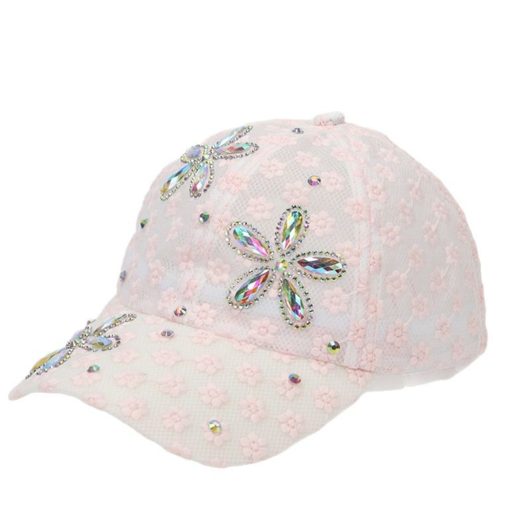The Liela Floral Crystal Hats bring bold glamour with oversized flower-shaped crystals on textured floral lace. Light-catching and full of personality, these hats are a statement in every shade—white, black, or light pink.