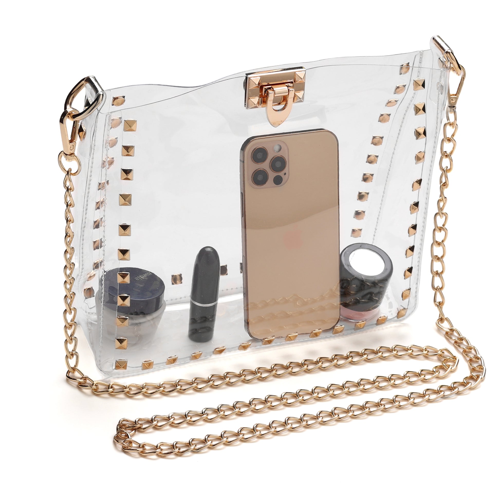 Made with durable crystal-clear PVC, Levy includes a removable gold chain-link strap to meet your style needs. It's the perfect concert companion and guaranteed to make you stand out!