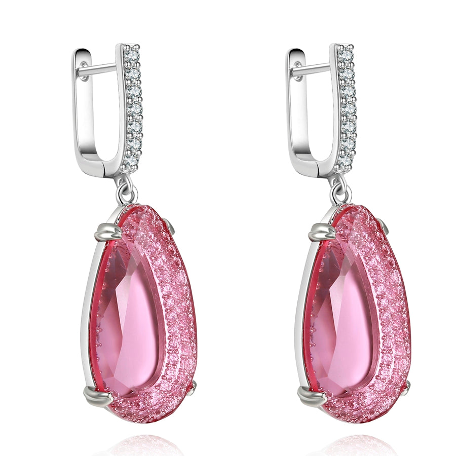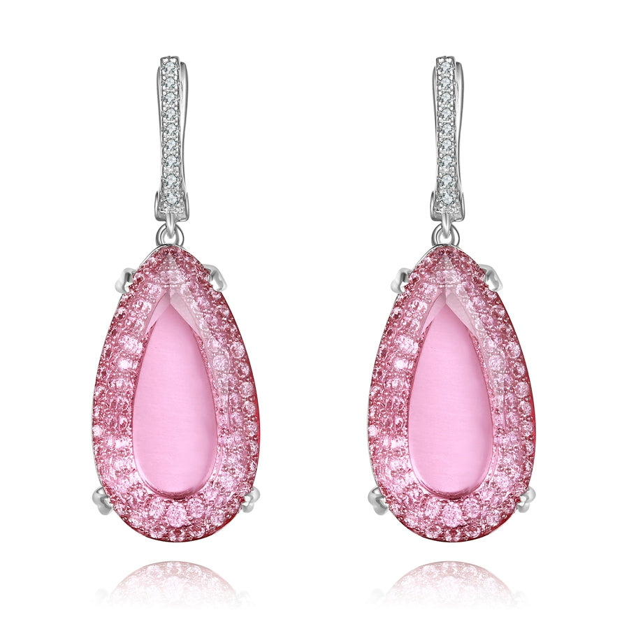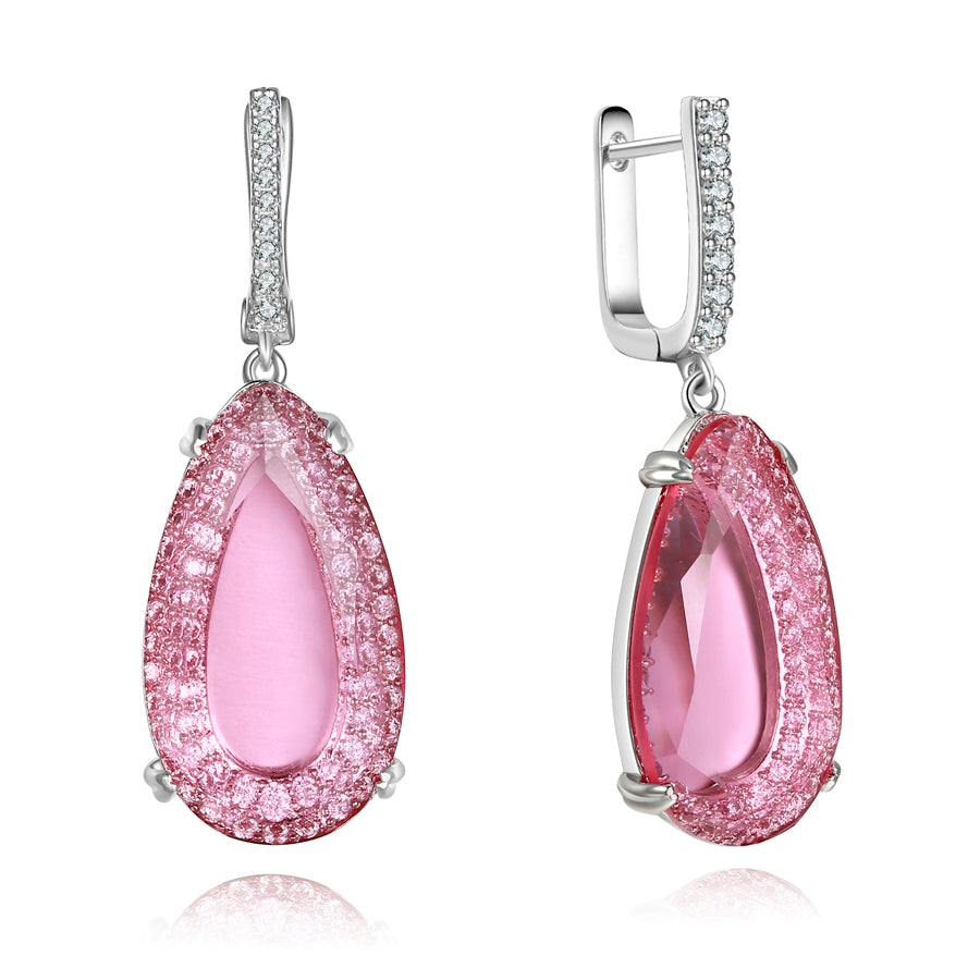 Our Lilly earrings exudes fabulous fashion & sleek style. This masterpiece is detailed with 2-layer rows of pave set cubic zirconias, then detailed and finished with a unique cut pear shape pink synthetic gemstone on top. The design exudes a style and class. The pink stone is cut to reflect different light and exude different shades from all angles. The ICON Collection is inspired with a message that true beauty shines from within.