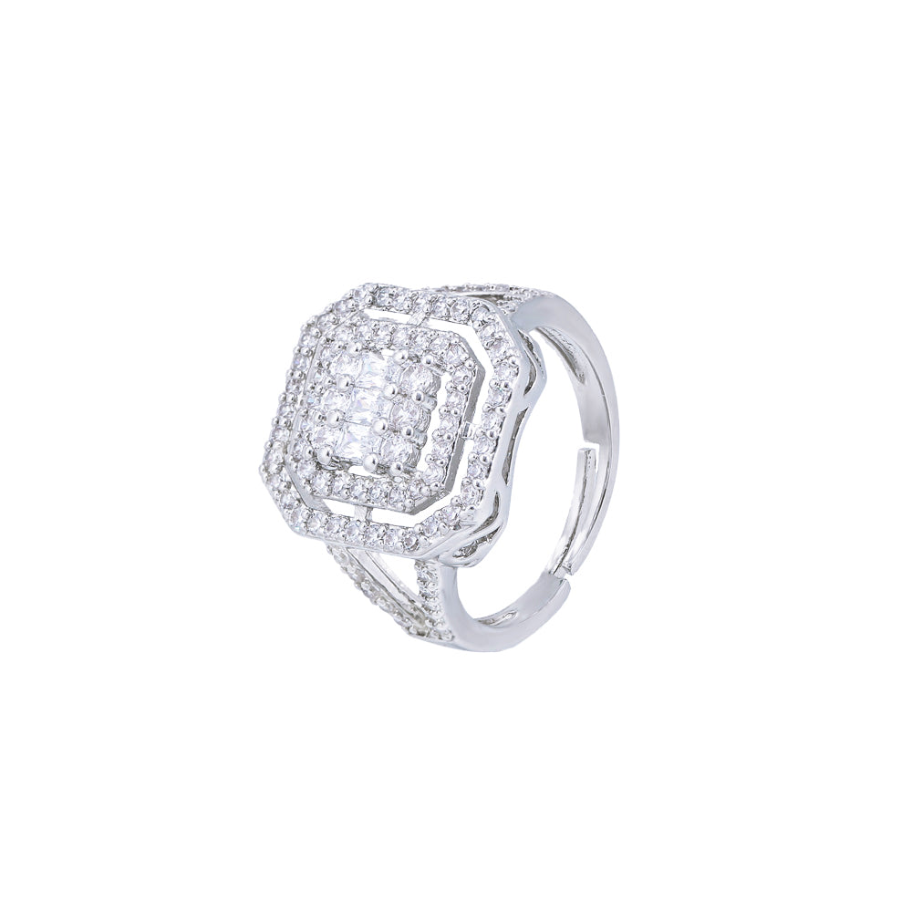 The Nadja Adjustable Ring showcases a striking octagon-inspired design, elegantly adorned with shimmering crystals. Its sleek silver-tone finish and adjustable fit make it a versatile accessory, adding a modern touch of sophistication to any look.