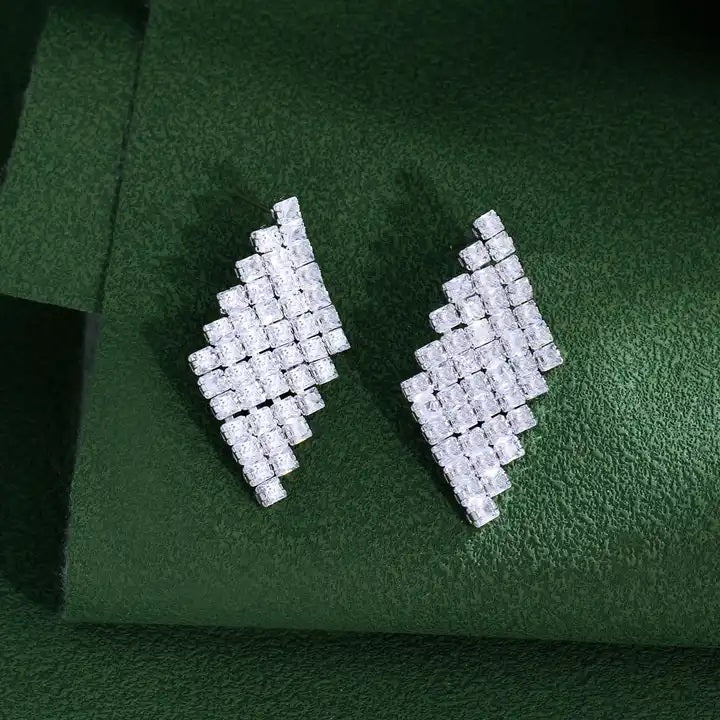 The Nara Designer Earrings are a striking example of geometric elegance, designed to capture the essence of contemporary chic. These statement earrings feature a cascade of square-cut crystals, meticulously arranged in a staggered brick pattern that creates a visually arresting zigzag silhouette. Each crystal is precision-cut to enhance its clarity and sparkle, ensuring that these earrings will catch the light and eyes from every angle. The silver-tone setting adds a sleek, modern finish, making the Nara Earrings the perfect accessory for the fashion-forward individual. Whether styled for a glamorous evening event or as a bold complement to a day look, these earrings are a testament to sophisticated design and exceptional craftsmanship.