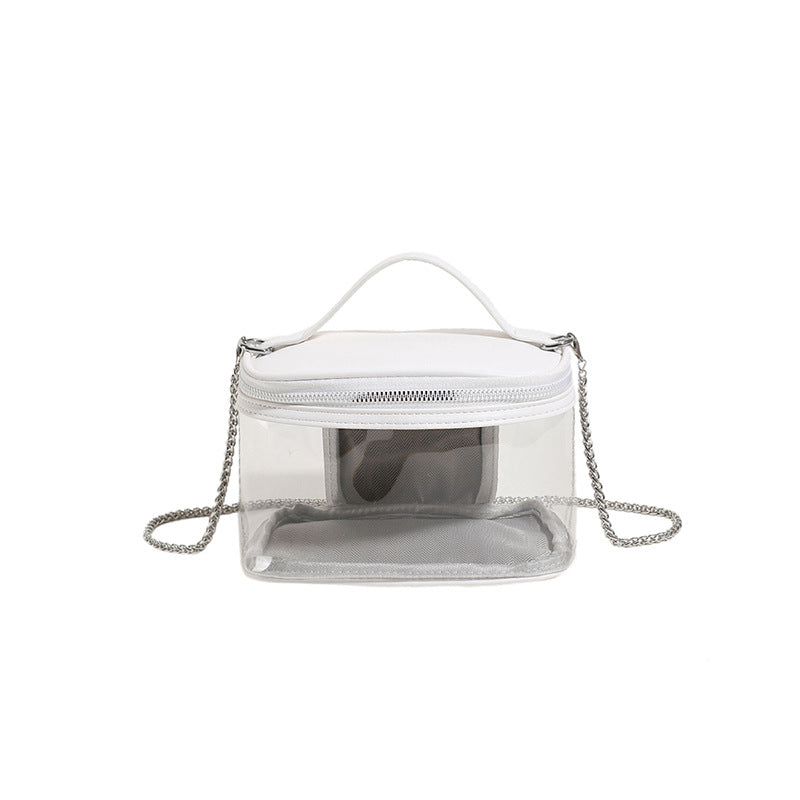 The Rinie Clear Handbag is a modern staple for the fashion-forward individual. Its transparent design is complemented by sleek white trim and a chic chain strap, making it perfect for showcasing your style essentials. This versatile bag pairs effortlessly with any outfit, making it a must-have accessory for any occasion.