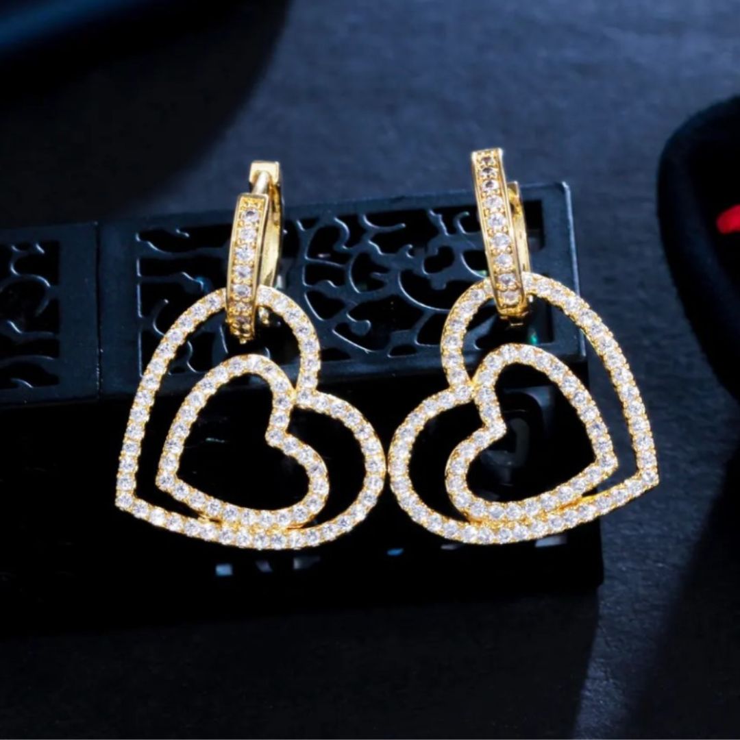 Introducing our new Romila Heart Earrings – a symbol of love crafted with exceptional attention to detail. These elegant earrings feature a double-heart design that combines a solid silhouette with an outlined form, both encrusted with a multitude of glittering stones. The play of the bold lines with the delicate pave setting creates a captivating optical allure. Hanging gracefully from a bar of stones, these earrings offer just the right amount of sparkle to transition flawlessly from day to night. With a secure back fastening, they provide both comfort and style. The Kordelia Heart Earrings are the perfect gift to express affection, or a luxurious addition to your own jewelry collection.