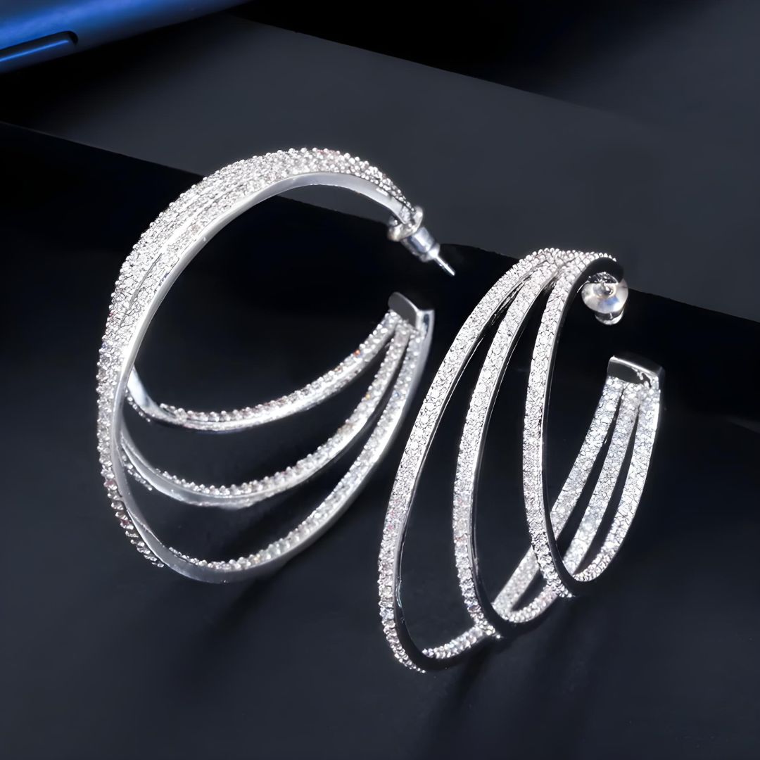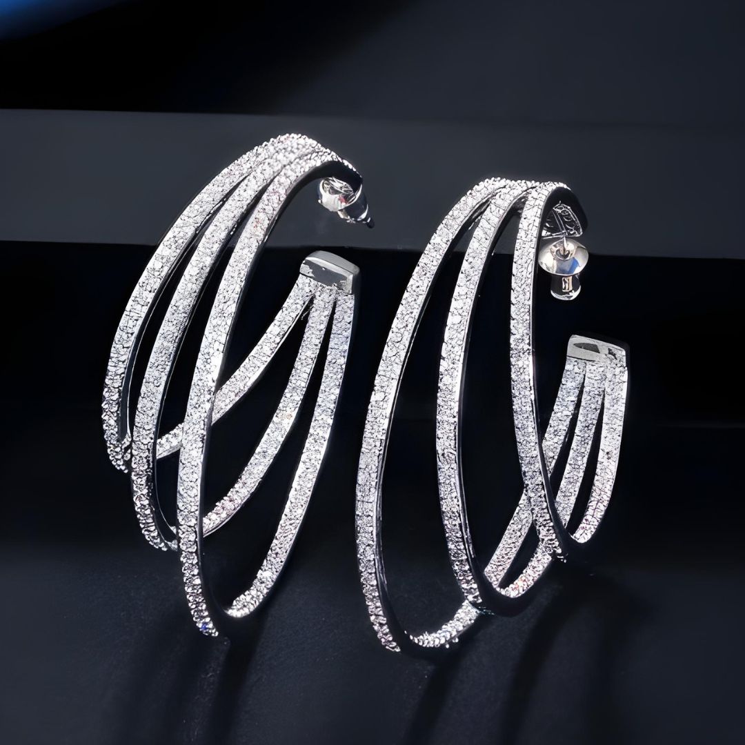 Elevate your style with our Roux Designer Hoop Earrings, a stunning blend of elegance and modern artistry. These dazzling earrings feature multiple delicate, crystal-encrusted hoops that intertwine gracefully, creating a bold yet sophisticated statement. Perfect for evening glamour or adding a touch of luxury to any outfit, they are crafted for those who appreciate fine design and timeless sparkle.