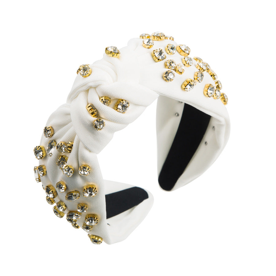 Introducing the Sherah Studded Headband, a bold and elegant accessory designed to turn heads. This headband features a soft fabric with a chic knot design at the center, adorned with gold-tone studs and sparkling crystals for an opulent finish. The combination of glamorous embellishments and a comfortable fit makes it perfect for special occasions or adding a touch of luxury to your everyday look. Elevate your style with the Sherah Studded Headband and embrace timeless elegance with a modern twist.