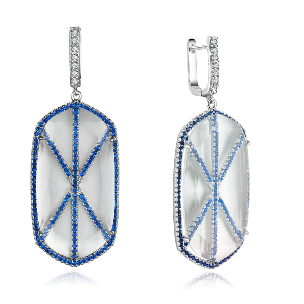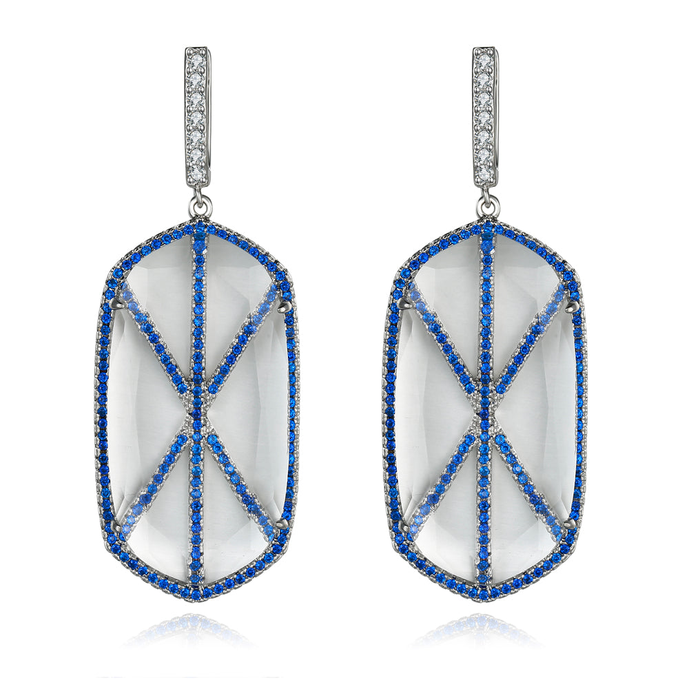 Our Audra earrings are the perfect accessory to dress to impress! These earrings are etched with a distinctive designer style cross of blue pave set cubic zirconias, perfectly fitted with a solid white synthetic gemstone on top. Dare to dazzle with this radiant piece! The Natalie Mills ICON Collection is inspired with a message that Strength lies within.