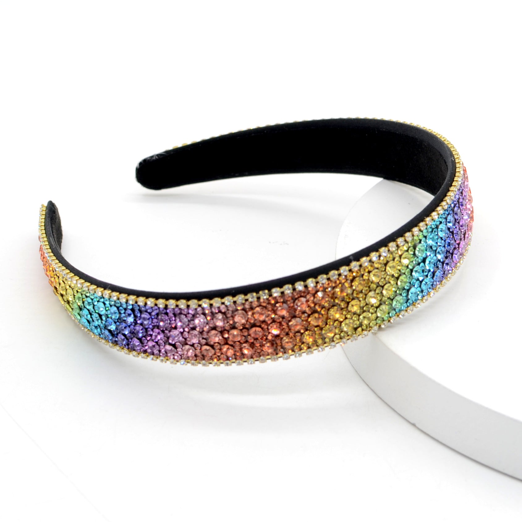 Our Violet headband is set with gorgeous rainbow-colored rhinestones and edged with gold. This thin, lightweight, non-slip headband is the perfect accessory for a night out!